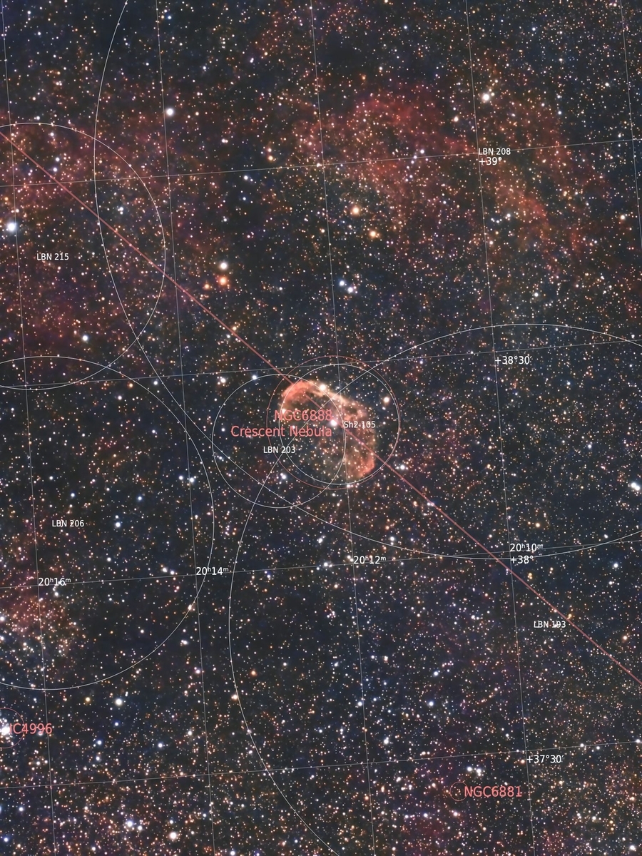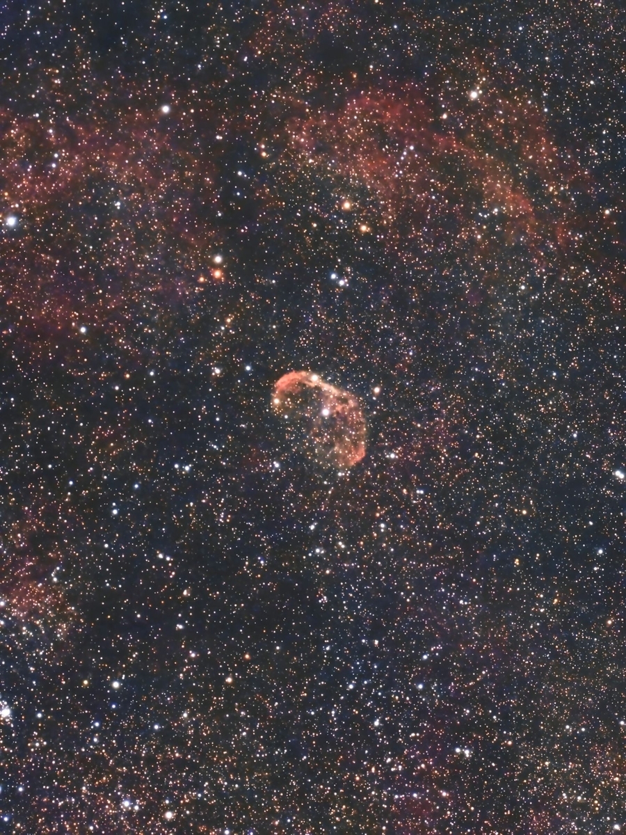 三日月星雲以外にも赤い星雲がたくさん広がっていて面白い領域です。