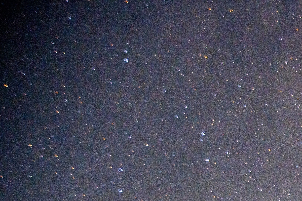これは私が天の川の写真を撮ったときの左上の部分をクロップしたものですが、星の形が矢印みたいなおかしな形になってますね。