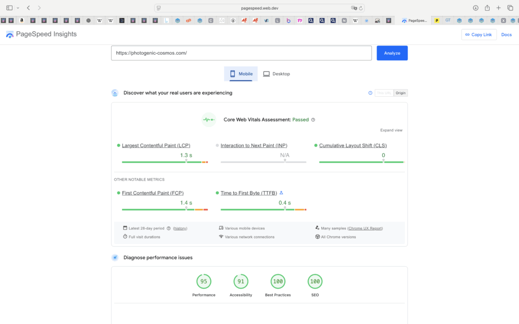 パフォーマンス95点、ユーザー補助91点、おすすめの方法100点、SEO100点でした!