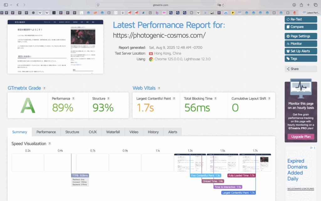 パフォーマンスが89%でLCPが1.7sでした。