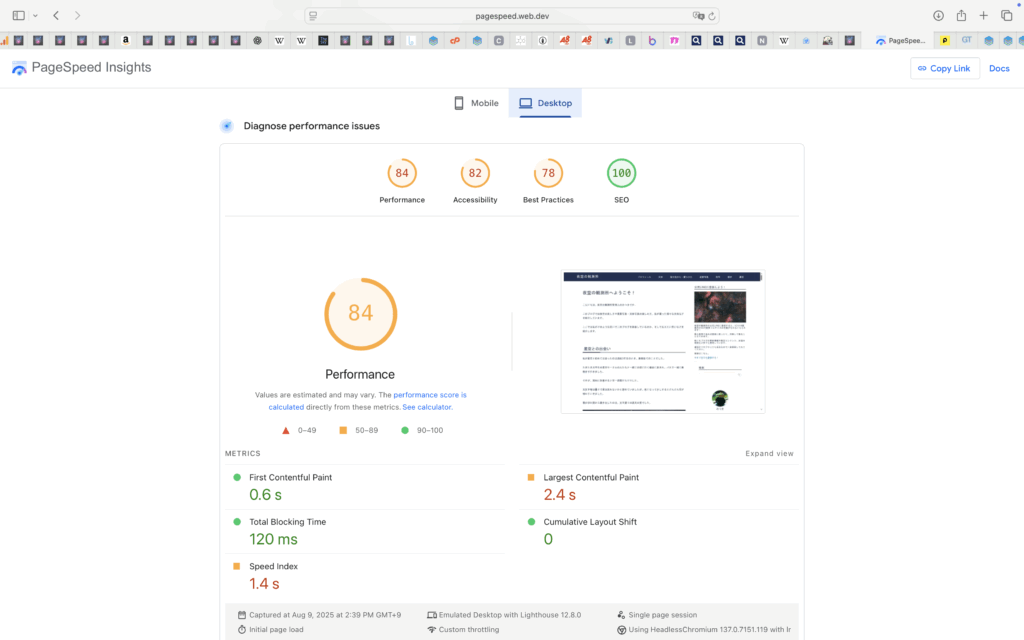 パフォーマンス84点、ユーザー補助82点、おすすめの方法78点、SEO100点でした。