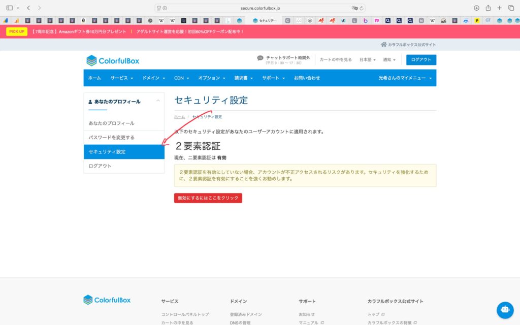ここで2要素認証が出てくるので、無効になっていたら有効化してください。