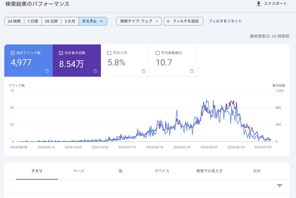 はてなブログの2024年8月から2025年8月の実際のサーチコンソールのクリック数のグラフはこちらです↓