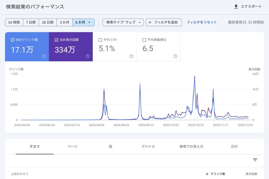 半年間で合計クリック数が17.1万回、合計表示回数が334万回にまで成長しました!
