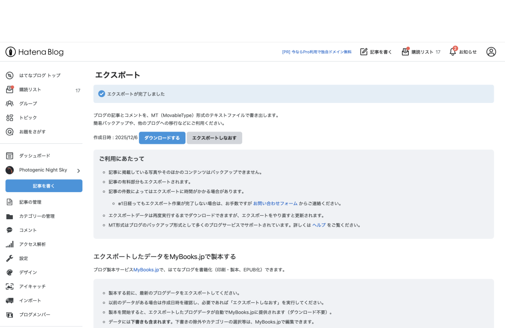 インポートしたらはてなブログのすべての投稿やページ、コメントが移されます。