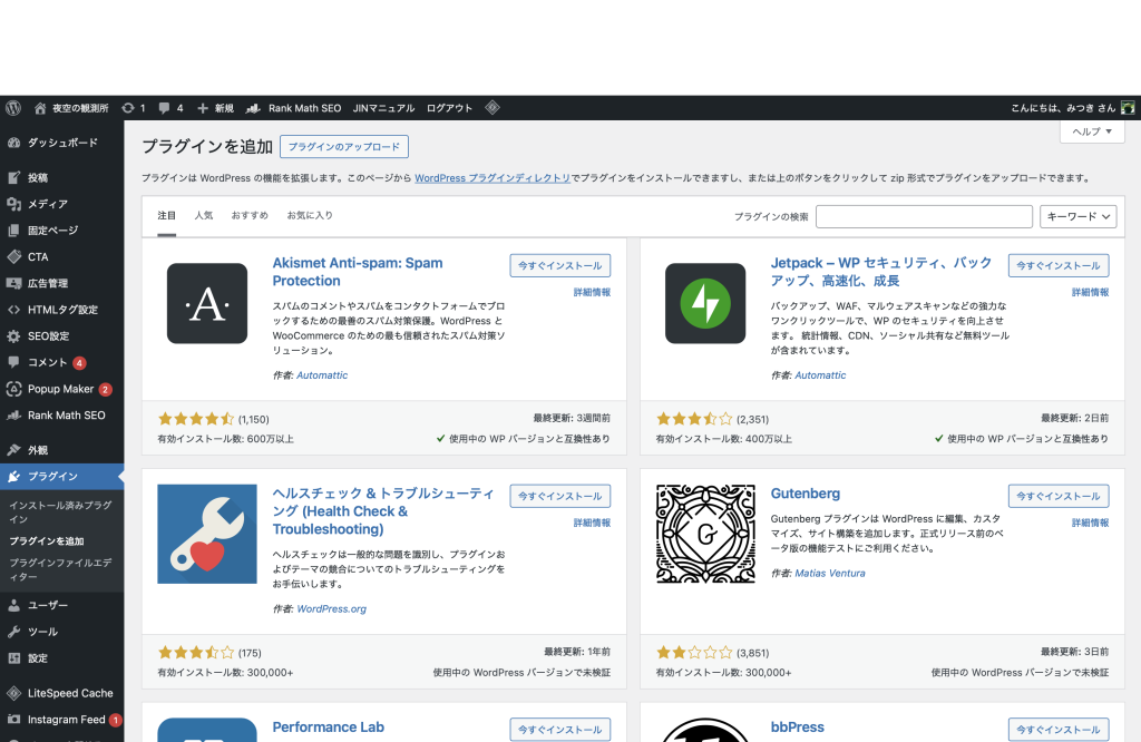 まずは左側のメニューから プラグイン > プラグインを追加 を選んでください。