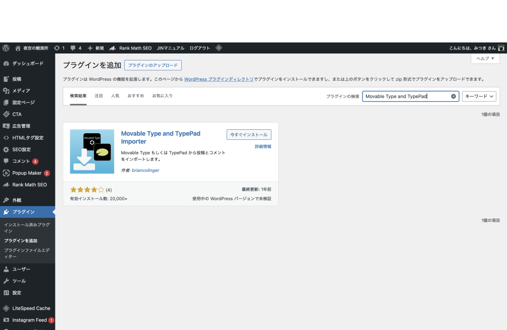 “Movable Type and TypePad Importer” というプラグインが現れるので、これをインストールしましょう。