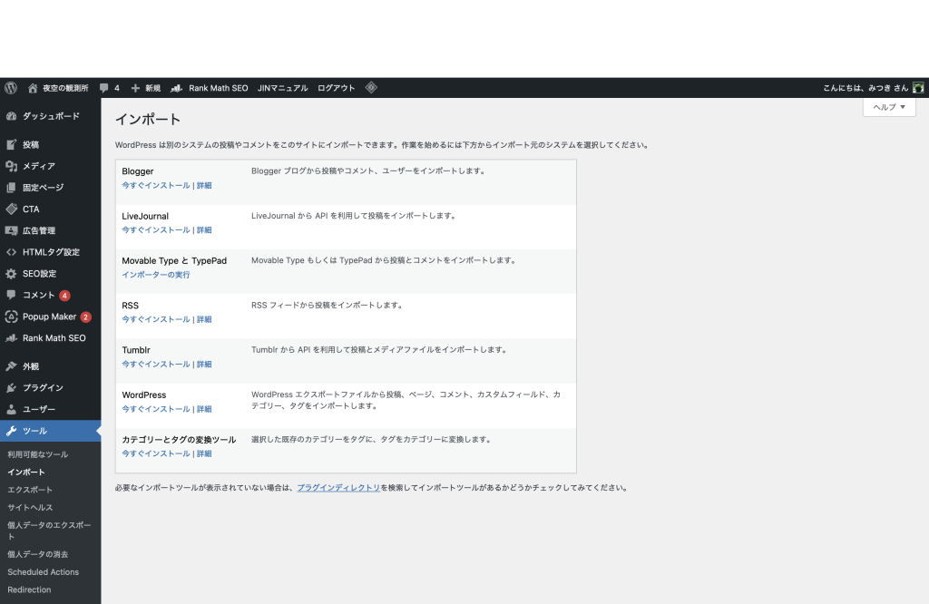 このプラグインを有効化したあと、左側のメニューから メニュー > インポート を選びましょう。