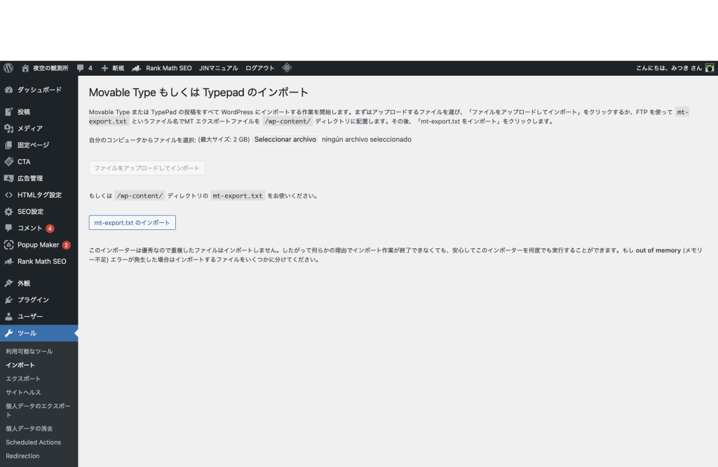 ここの「自分のコンピュータからファイルを選択」の右にファイルをアップロードできる部分があるので、さきほどはてなブログからエクスポートしたファイルをアップロードしてインポートしましょう。