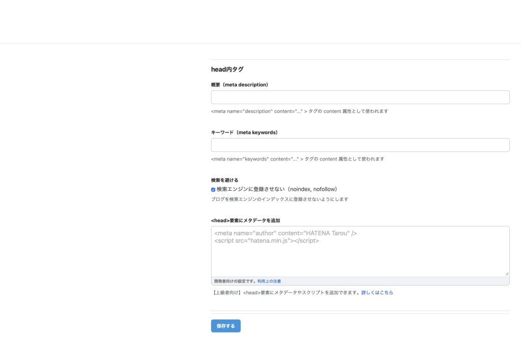 次にはてなブログの記事が検索結果に残らないように、インデックスをしないようにするnoindexタグを付与しましょう。