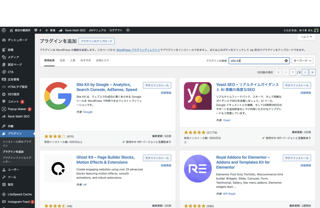 再び「プラグイン」から「プラグインを追加」を選び、検索窓に Site Kit と入力します。